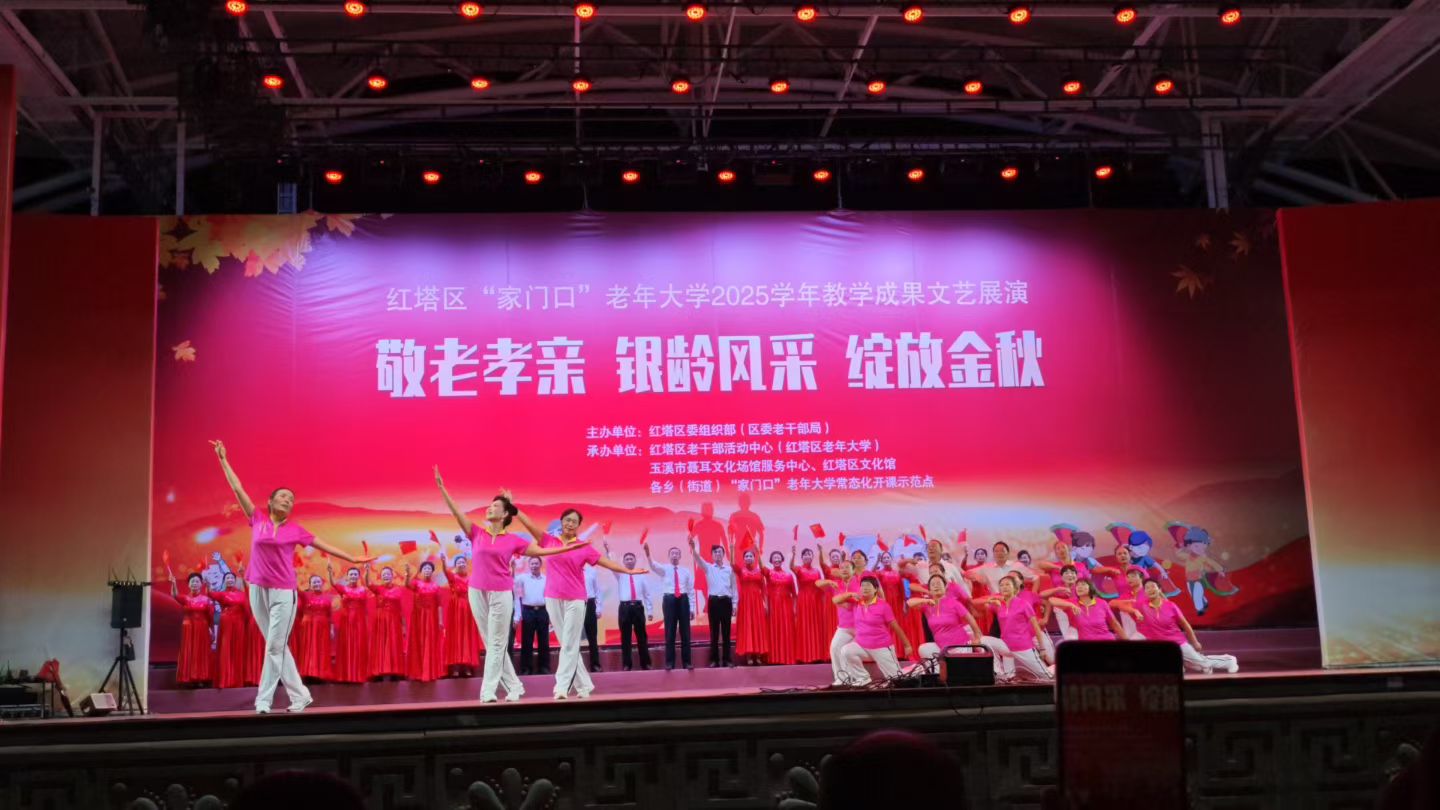 2025年10月25日至26日,红塔区“家门口”老年大学2025年教学成果文艺展演在聂耳广场温情启幕,其中25日为老年大学本部学员专场演出,26日迎来11个社区学员登台亮相,表演内容涵盖歌舞、器乐、瑜伽、武术、朗诵等类别的节目,充分展现“老有所学、老有所乐”的银龄风采。红塔区文化馆作为联合办学合作伙伴,全程赋能,彰显公共文化服务核心职能。