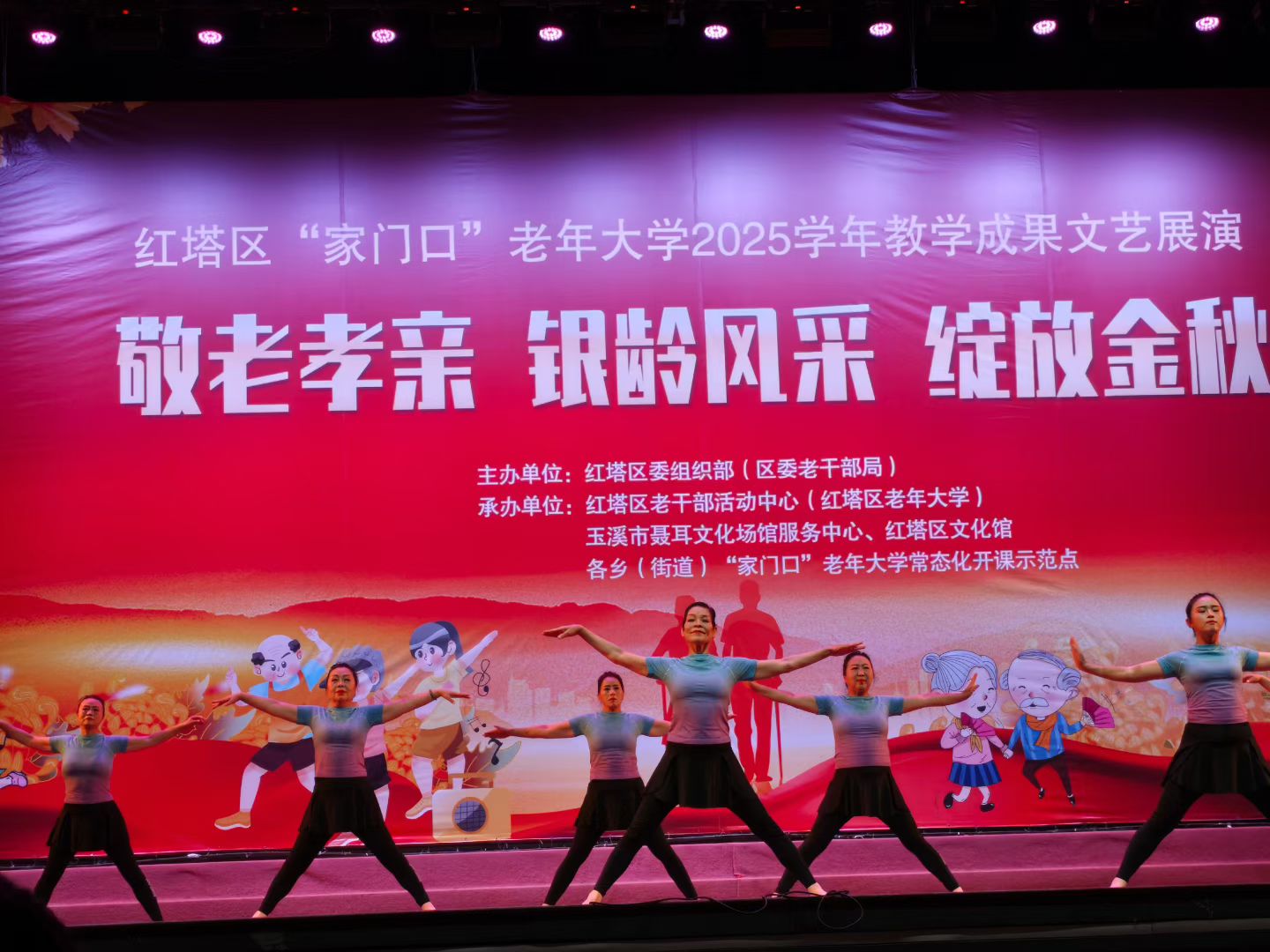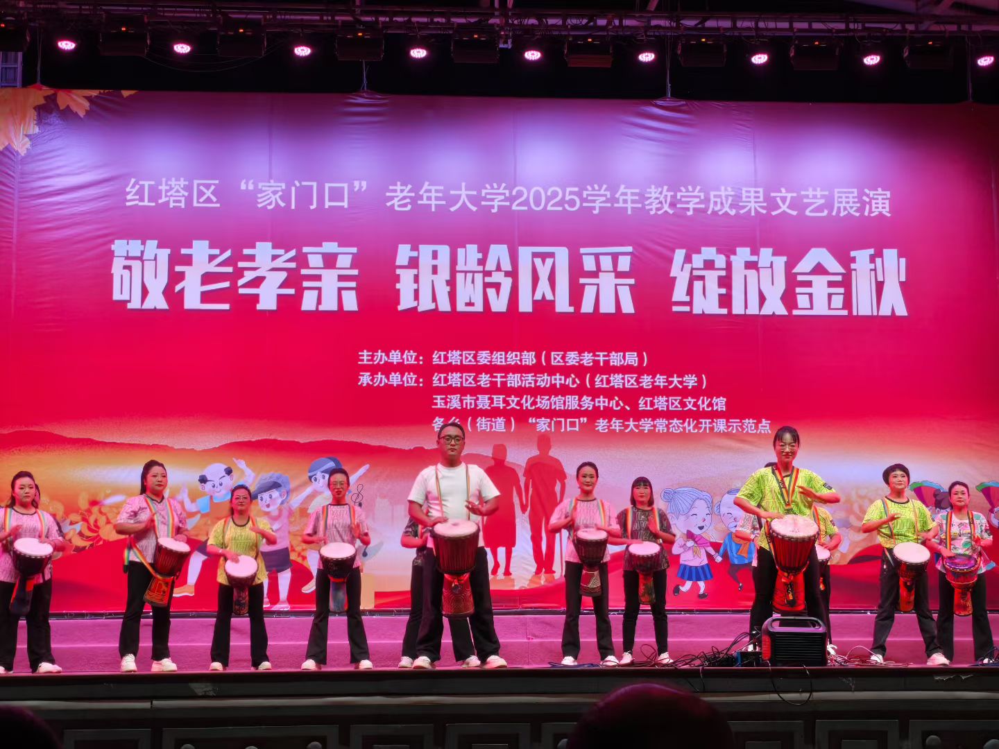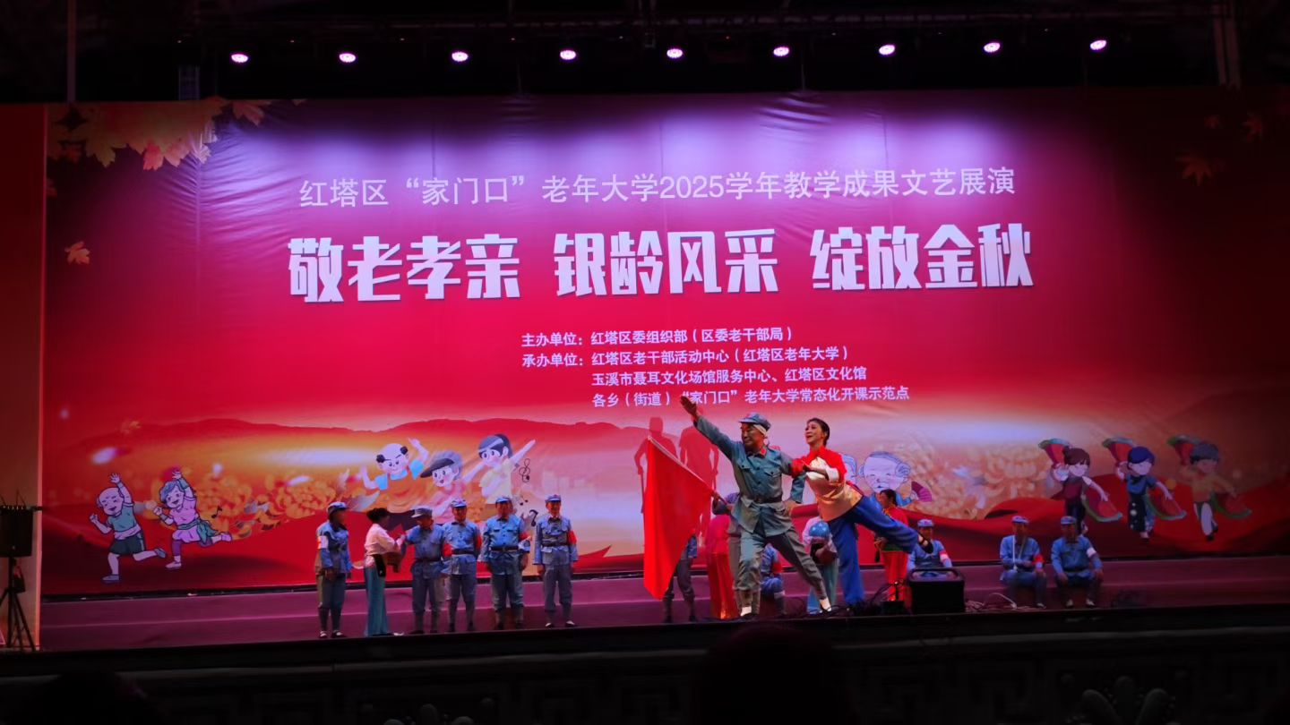 2025年10月25日至26日,红塔区“家门口”老年大学2025年教学成果文艺展演在聂耳广场温情启幕,其中25日为老年大学本部学员专场演出,26日迎来11个社区学员登台亮相,表演内容涵盖歌舞、器乐、瑜伽、武术、朗诵等类别的节目,充分展现“老有所学、老有所乐”的银龄风采。红塔区文化馆作为联合办学合作伙伴,全程赋能,彰显公共文化服务核心职能。